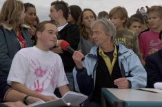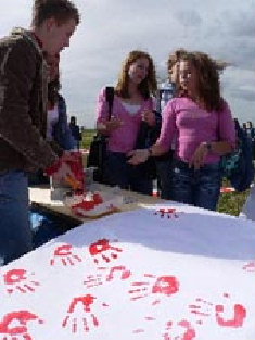 an denen jeweils zwei Jugendliche die Farbe auf die vielen
