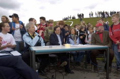 die langen Papierbahnen weiterzuziehen und bei Windböen